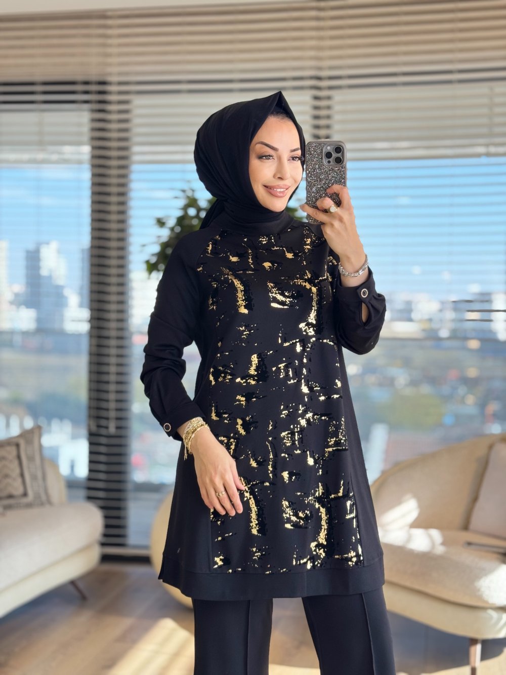 01-1290 Önü Varak Baskılı Tunik Siyah Gold