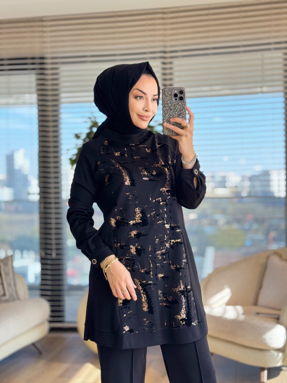 01-1290 Önü Varak Baskılı Tunik Siyah Leopar