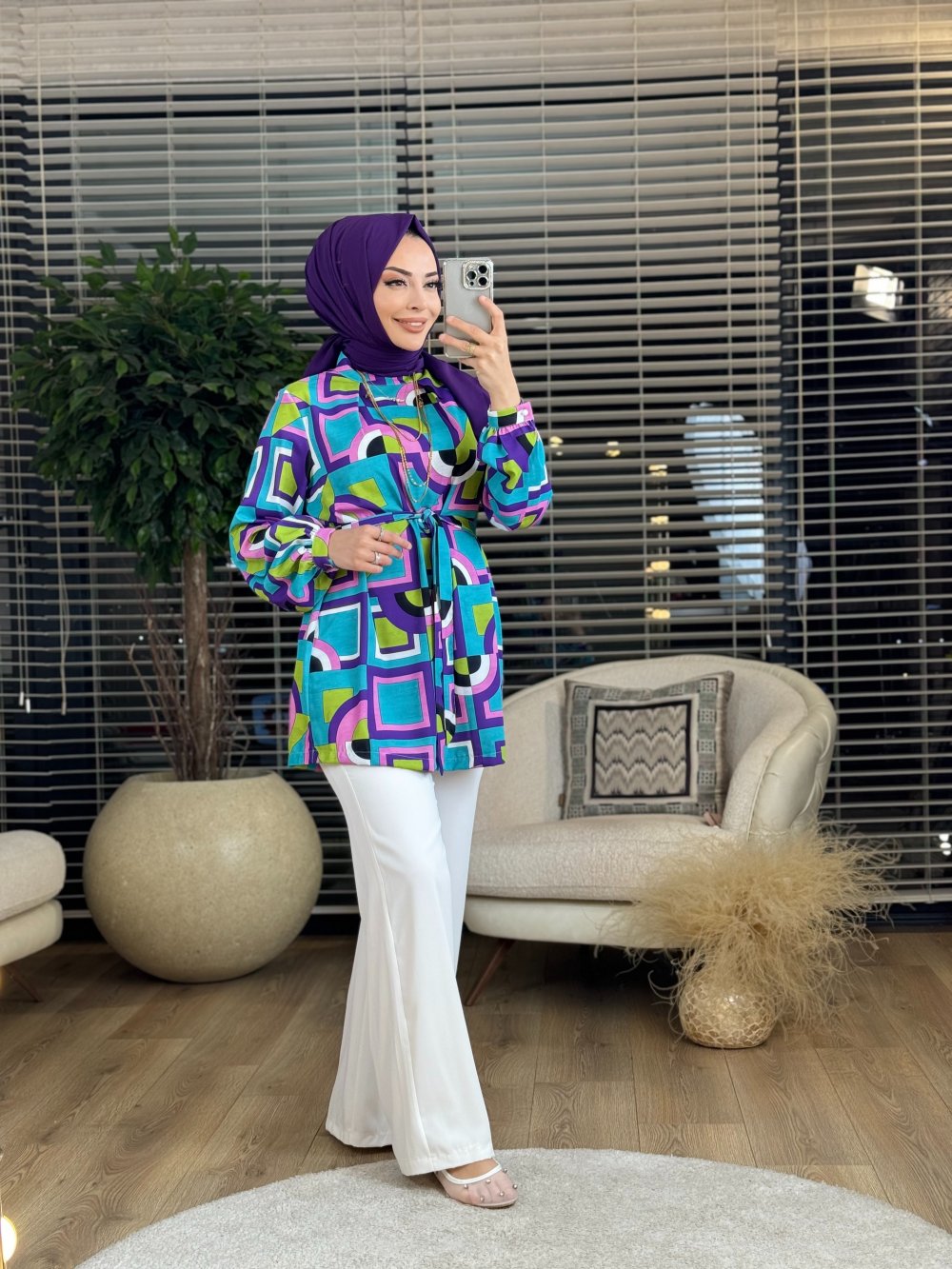 02-2062 Renkli Geometrik Desen Takım Yeşil Ekru
