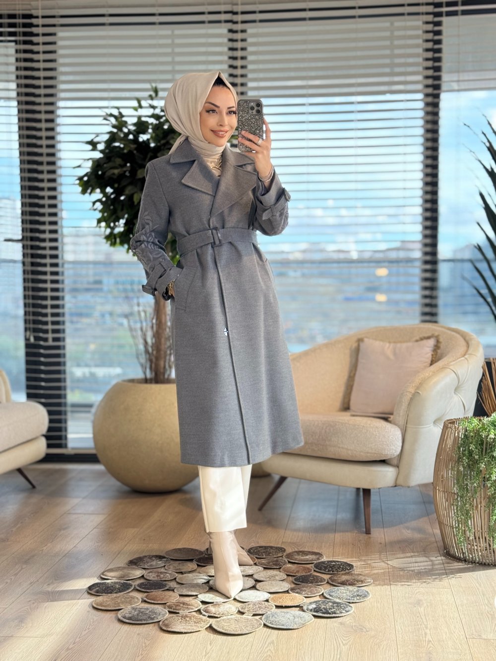 06-1125 Kolları Nakışlı Kaşe Kaban Antrasit