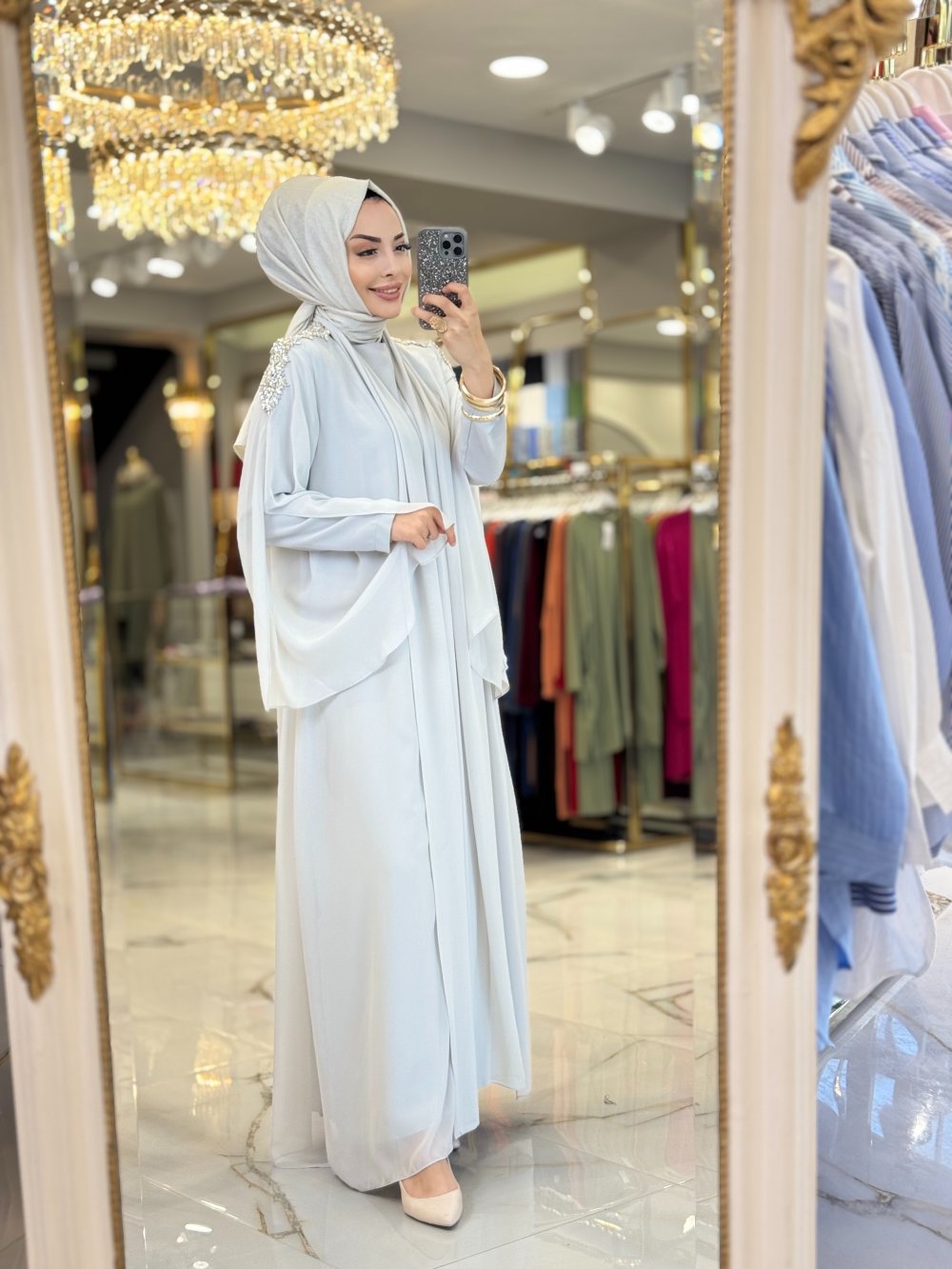 10614 Üst Şifon Omuzları Taş İşli 2li Takım Gri