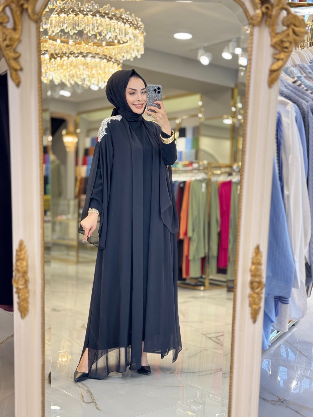 10614 Üst Şifon Omuzları Taş İşli 2li Takım Siyah