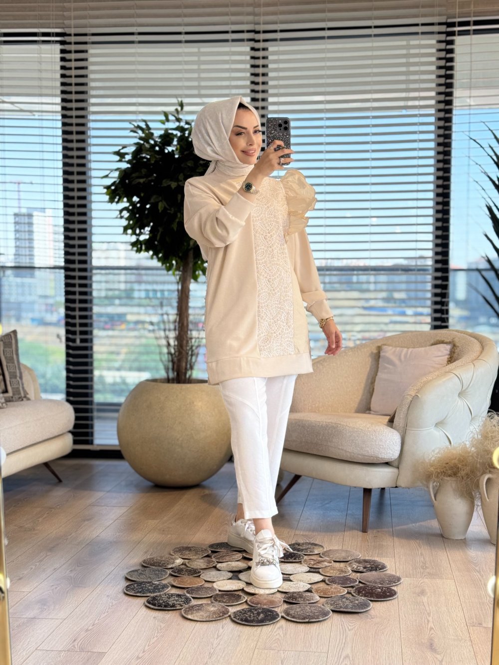 10628 Ön Sutaşı Ve Fırfır Detaylı Tunik Bej