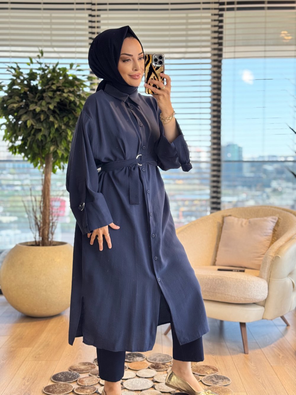10753 Manşeti Kuşaklı Uzun Ön Düğmeli Tunik Lacivert