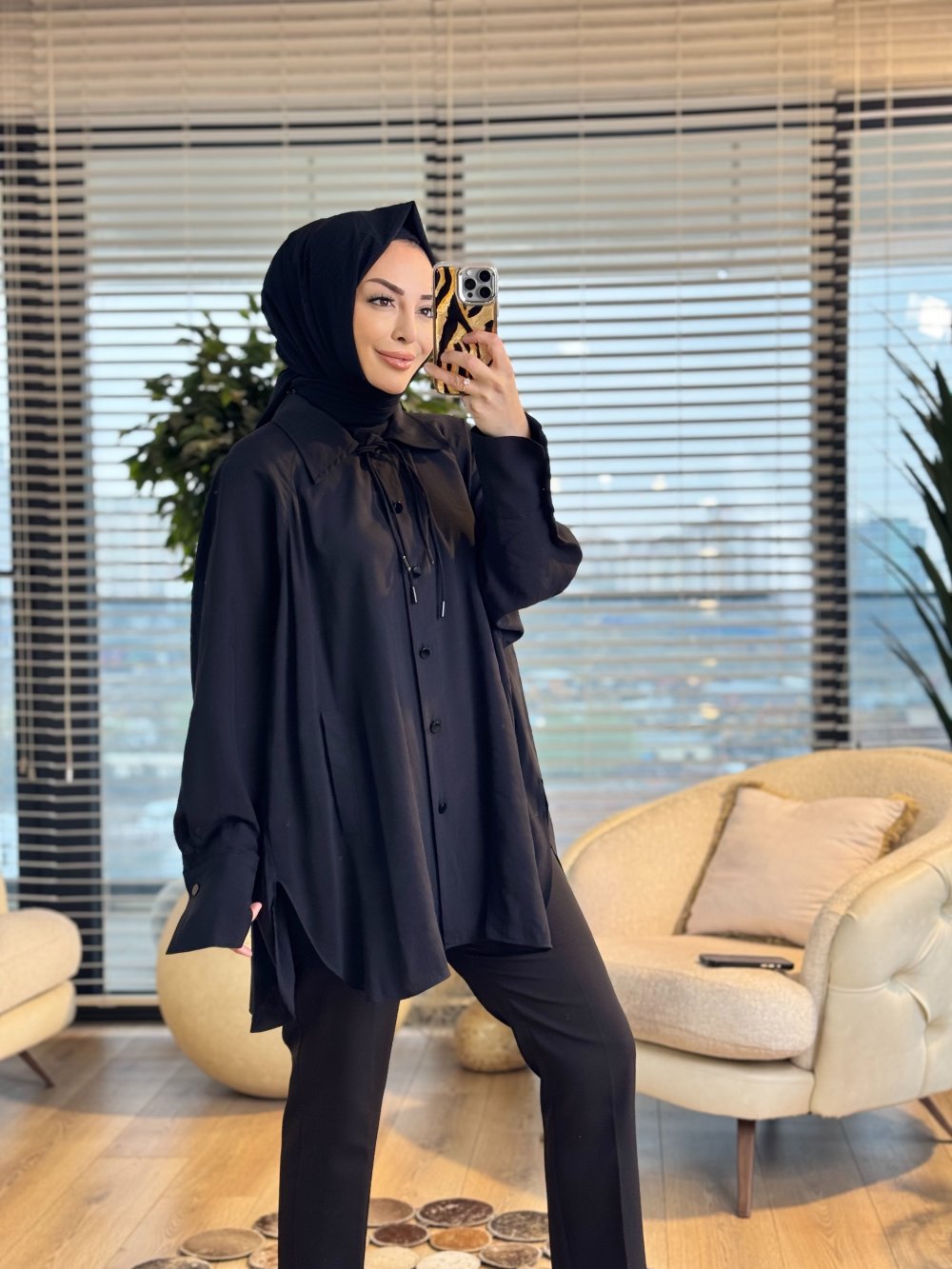 10772 Yakası İp Bağcıklı Gömlek Siyah