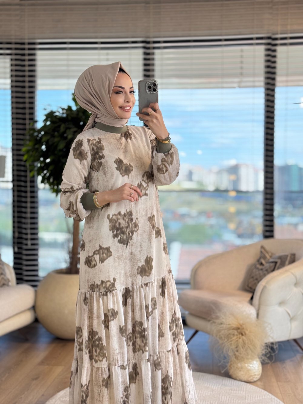 12605 Şifon Üstü Batik Desenli Elbise Haki