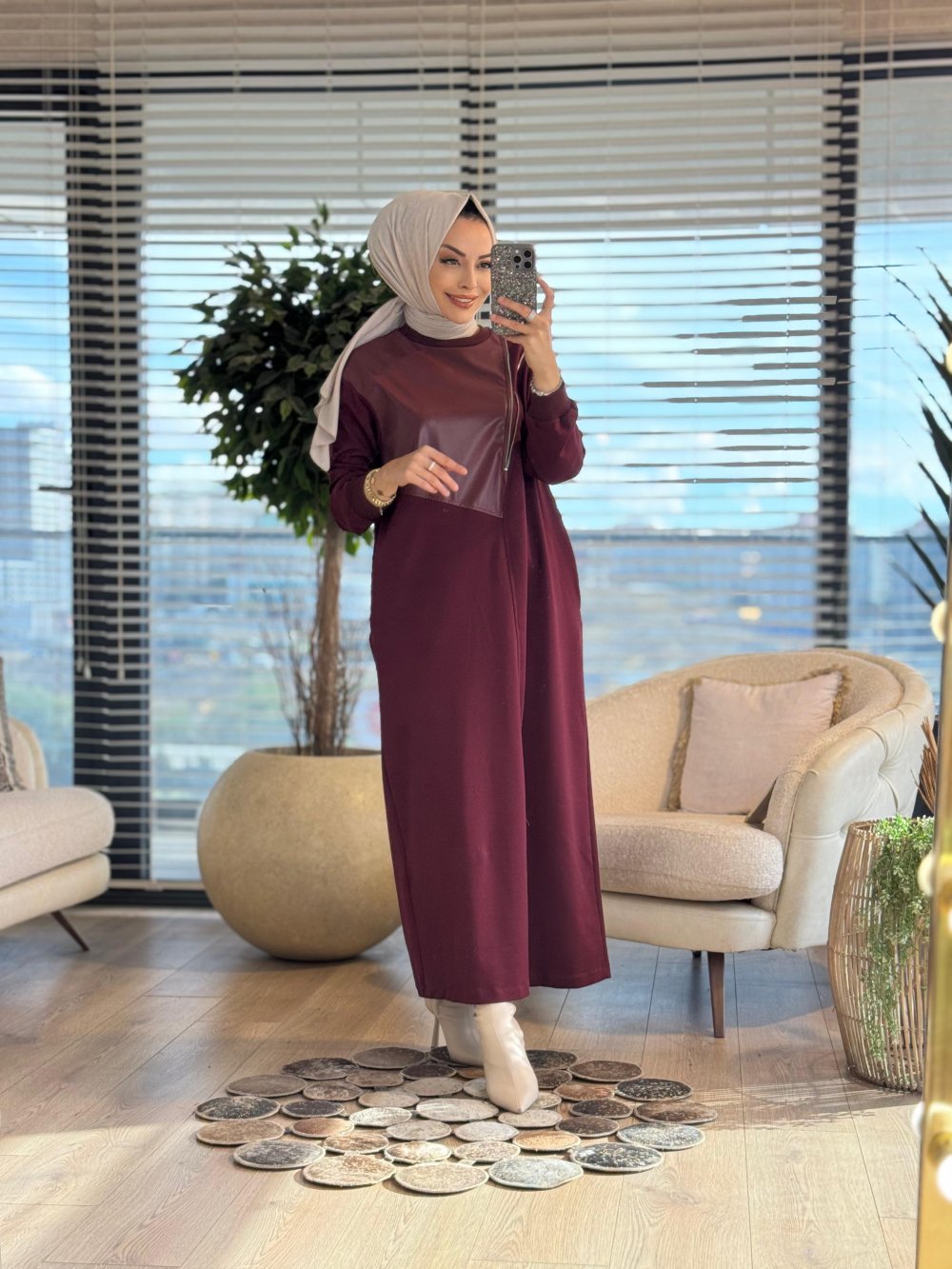 12656 Deri Parçalı Fermuar Detaylı Elbise Bordo