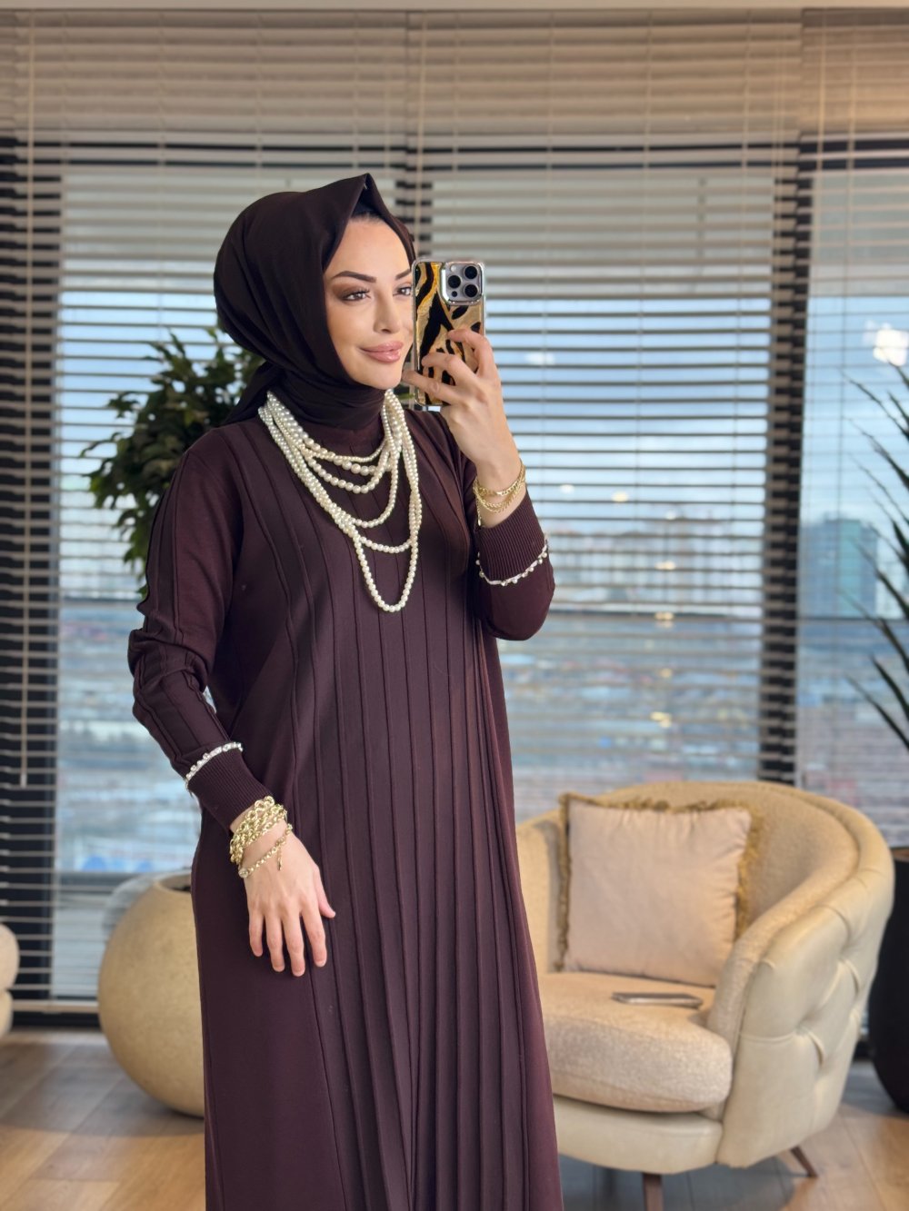 140 Etek Kol Ucu Sutaşlı Triko Elbise Kahve