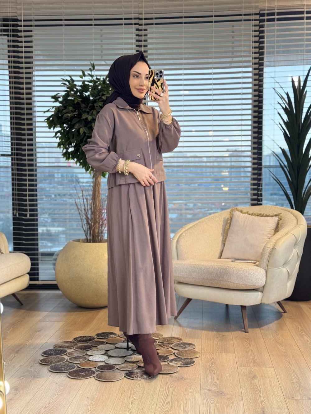 14436 Önü Cep Ve Fermuarlı Etekli Takım Vizon