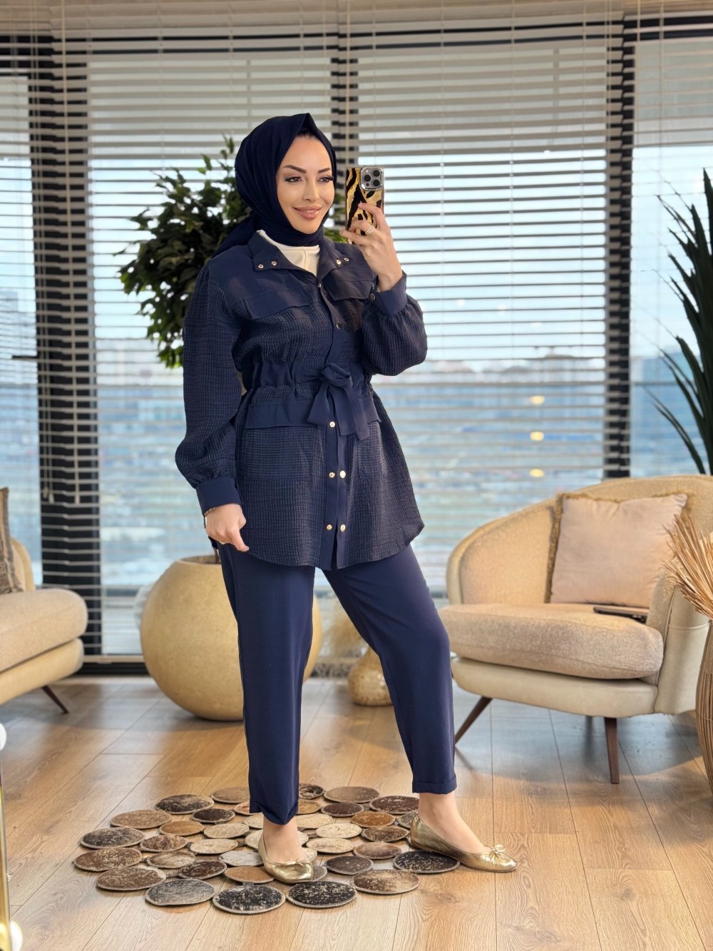 14451 Ön Ve Kolu Gofre Detaylı Takım Lacivert