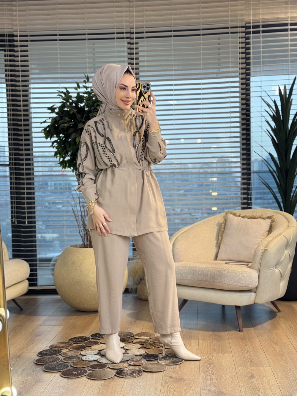 1465 Ön Kol Boncuk Taş İşleme Fermuarlı Takım Bej