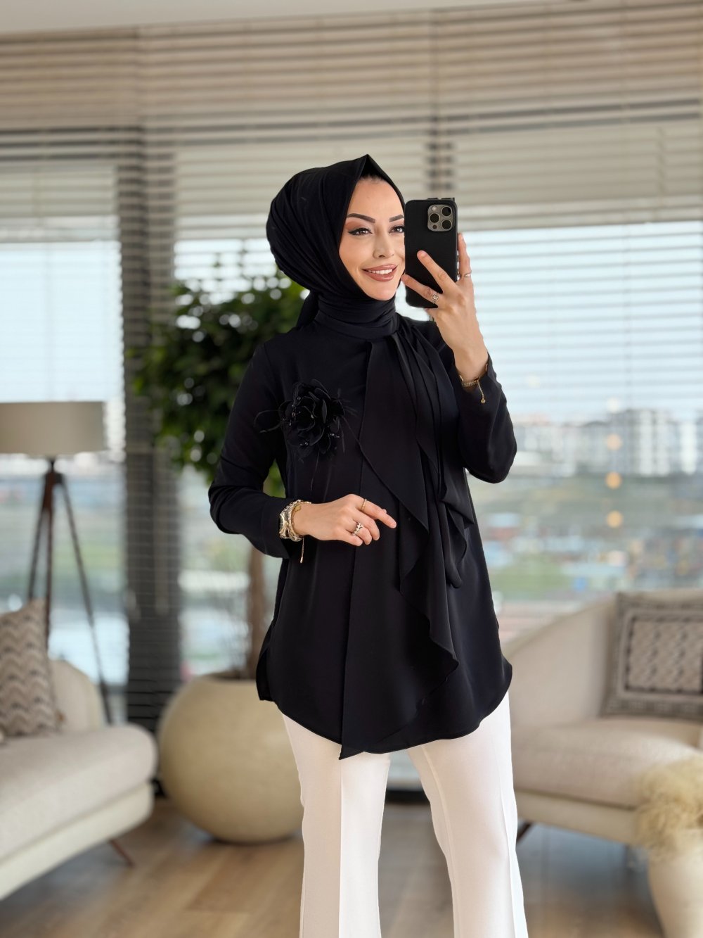15-1030 Yaka Fular Parçalı Bluz Siyah