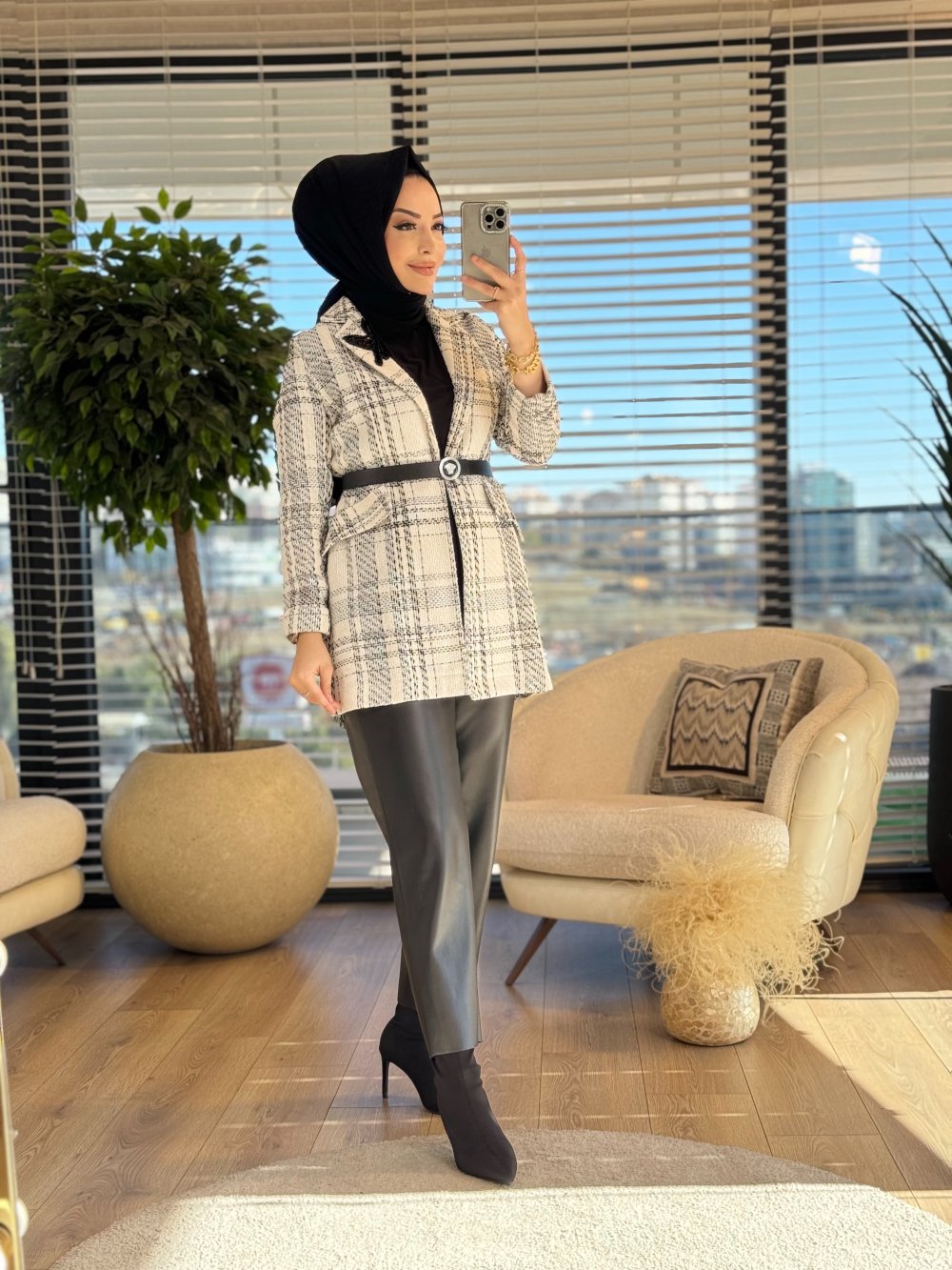 16704 Kareli Yaka Boncuk Kuş İşli Ceket Ekru