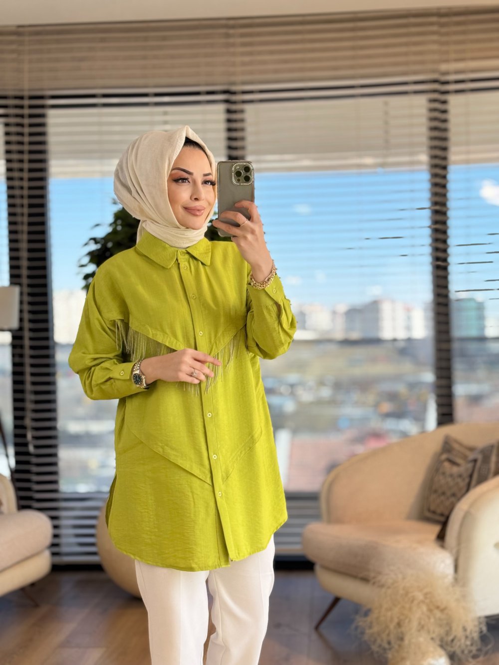2055 Ön V Zincir Ve Parça Detaylı Gömlek Yağ Yeşili