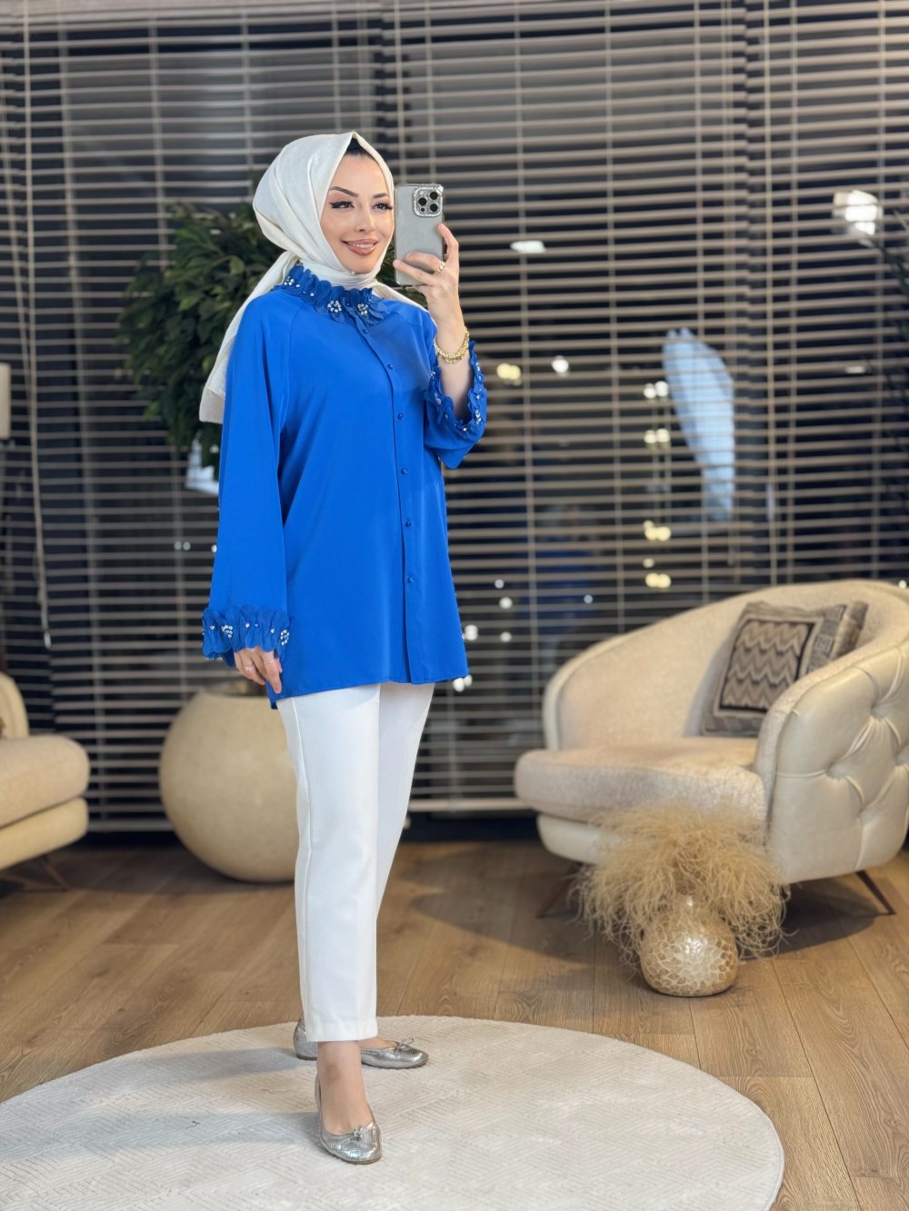 2058 Yaka Manşet Fırfır Taş Detaylı Gömlek Saks