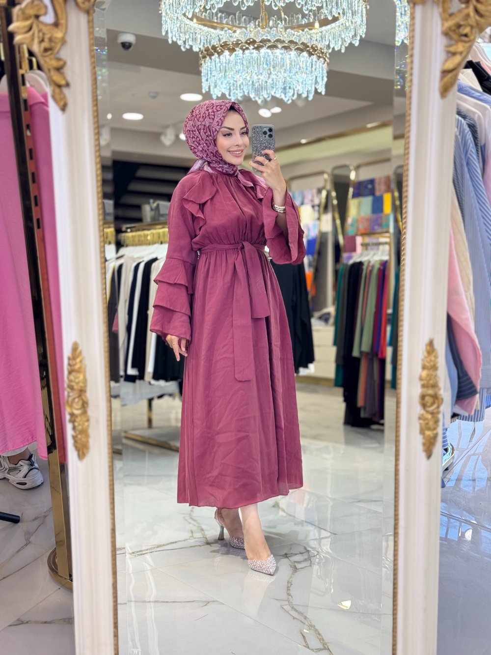 20717 Ön Kol Fırfırlı Elbise Bordo