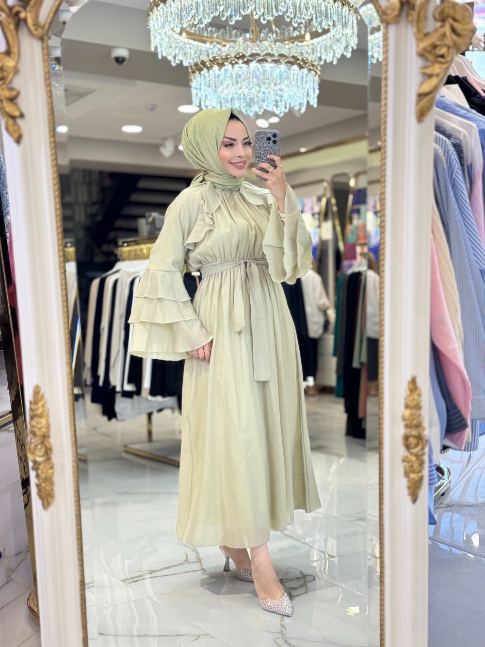 20717 Ön Kol Fırfırlı Elbise Çağla