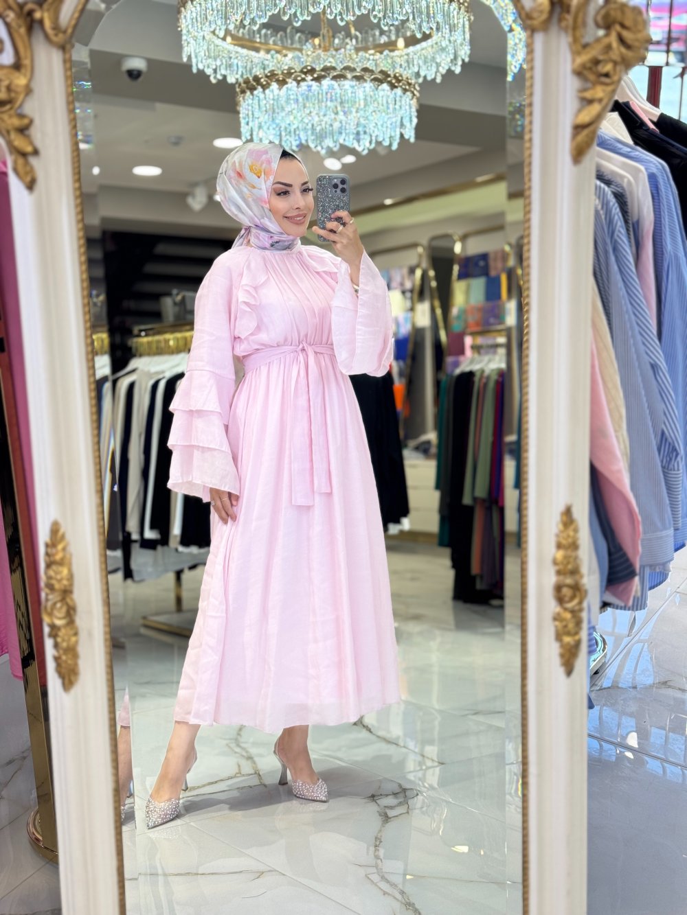 20717 Ön Kol Fırfırlı Elbise Pembe