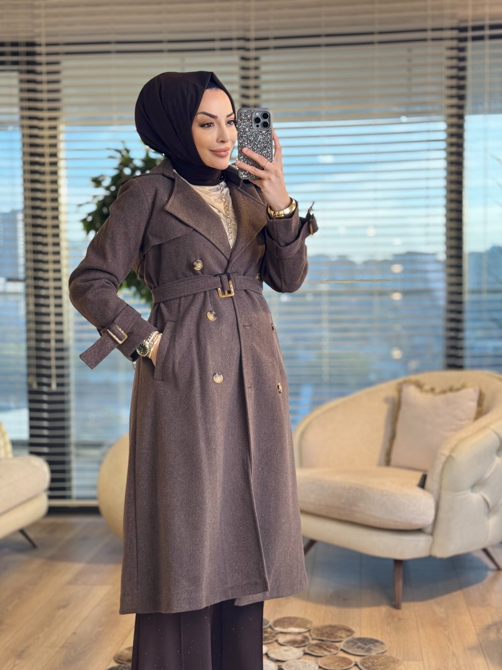 2141 Kaşe Altı Düğmeli Uzun Kaban Kahve