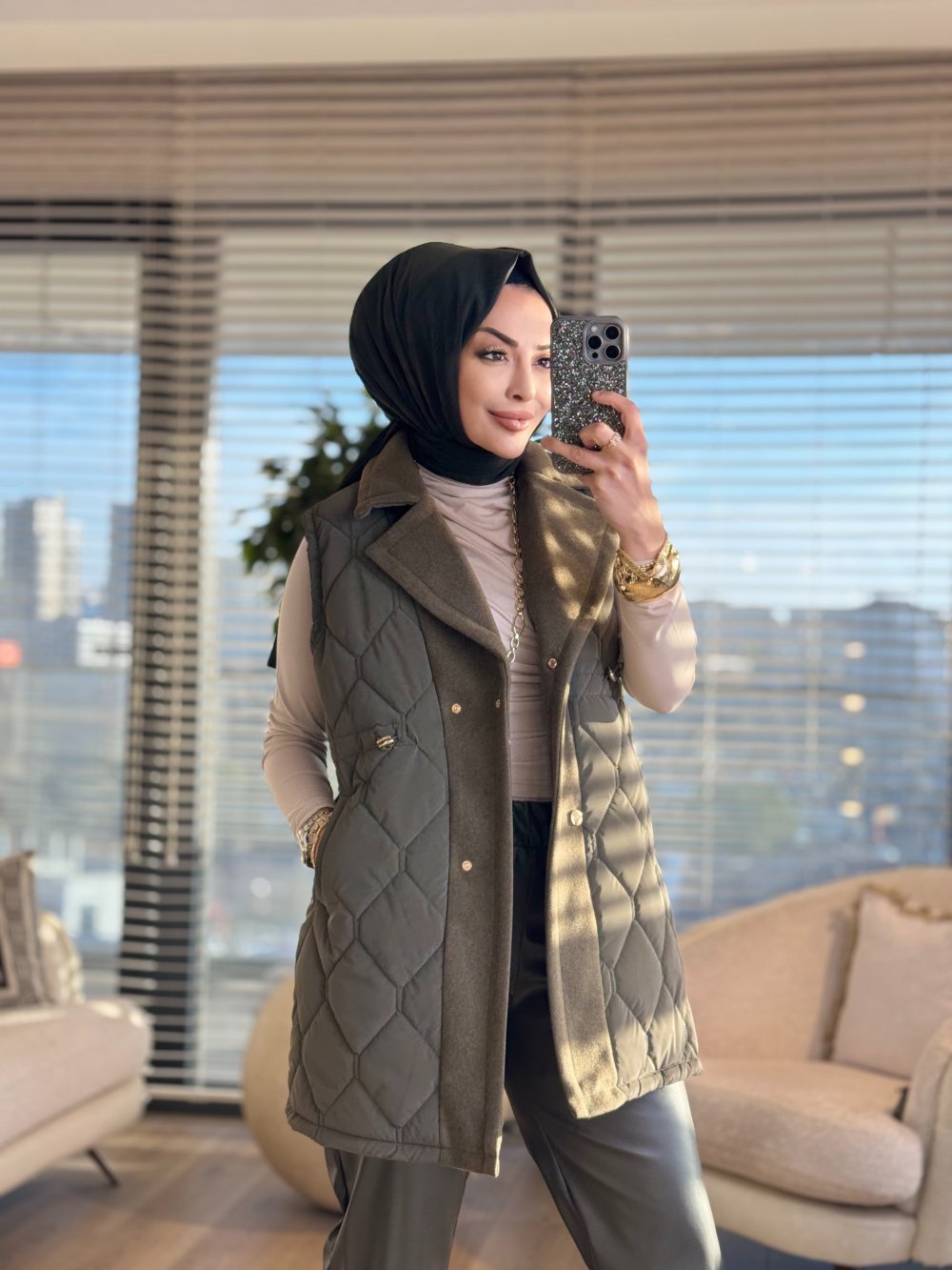 2190 Kapitone Kaşe Detaylı Yelek Haki