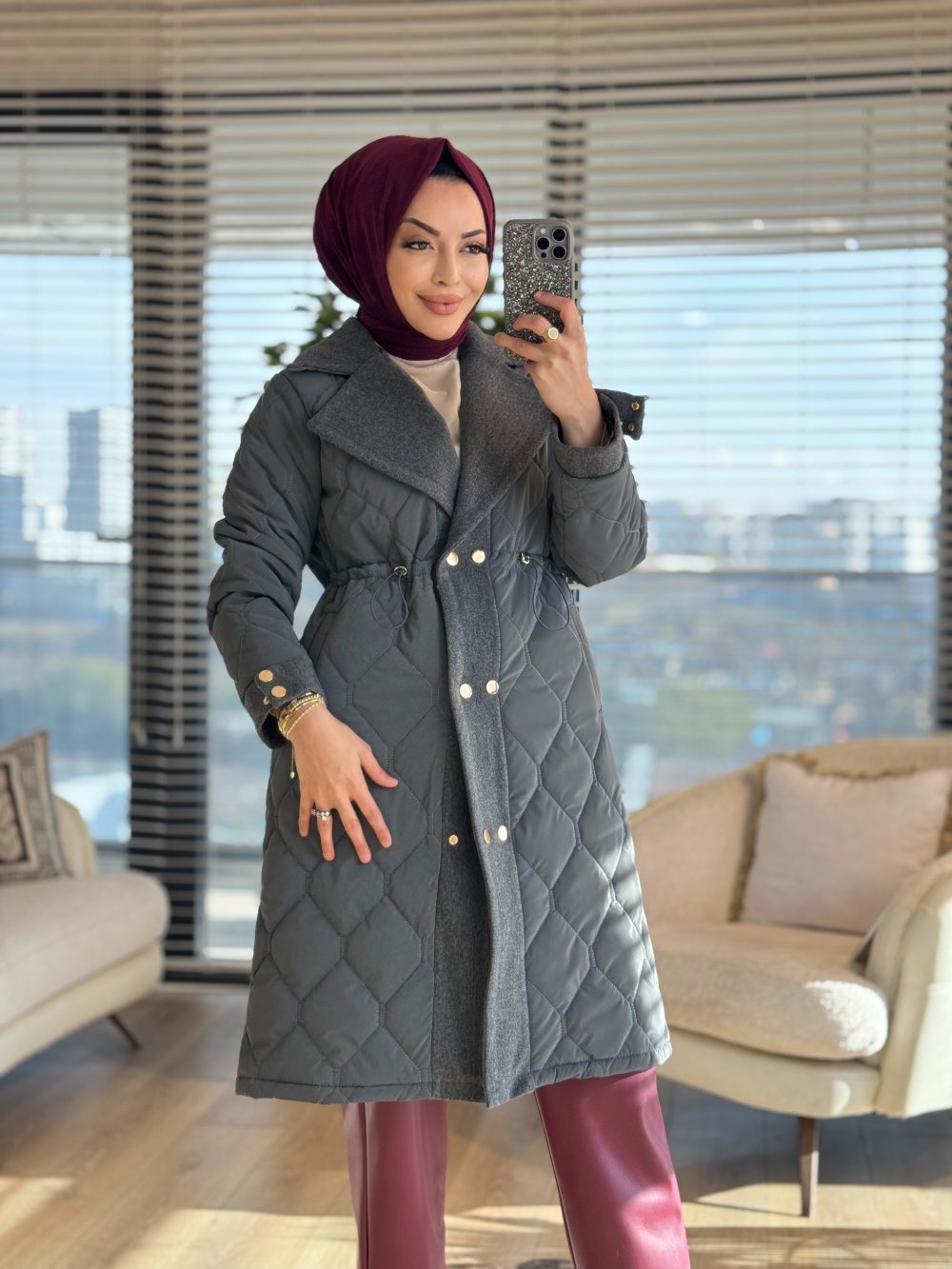2208-1 Kapitone Kaşe Garnili Uzun Kaban Antrasit