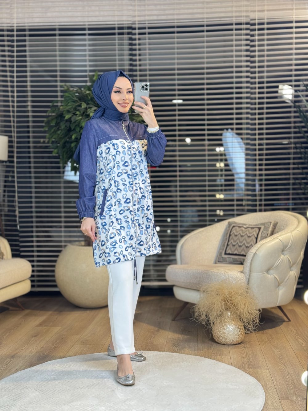 2232 Ön Desenli Fermuarlı Sıfır Yaka Tunik Lacivert