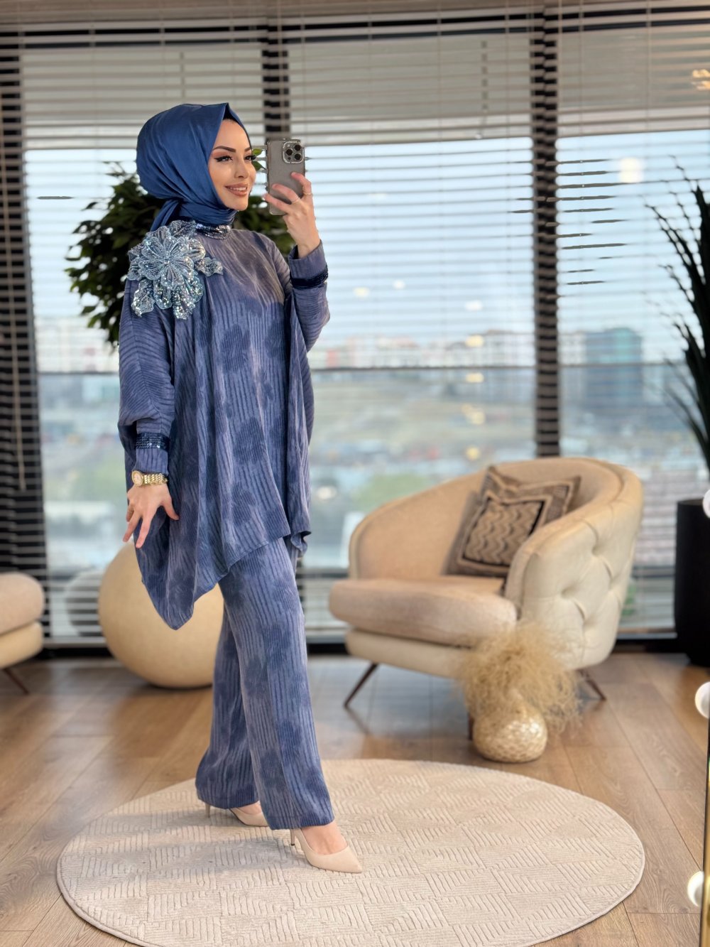 2272 Büyük Çiçek Broşlu Takım İndigo