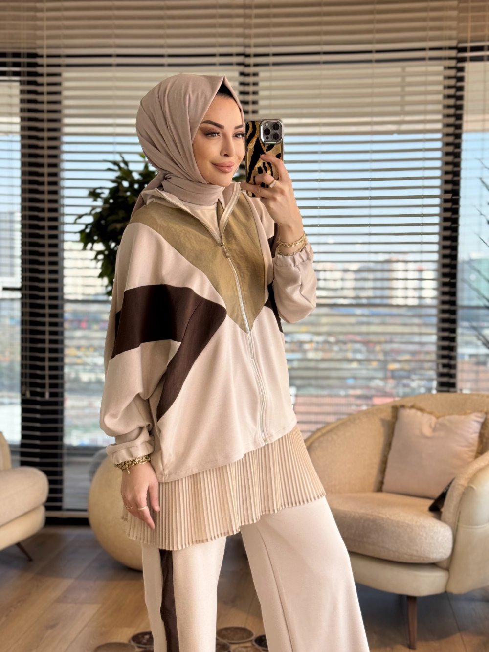 22836 Önü Renkli Parçalı Fermuarlı Takım Bej