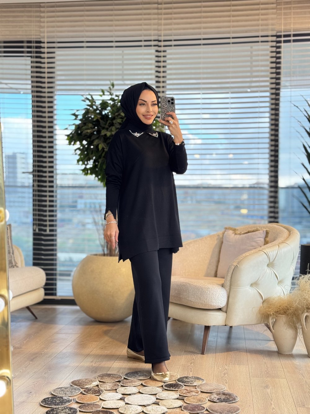 239 Yakası Pırlanta Taşlı Triko Tunik Siyah