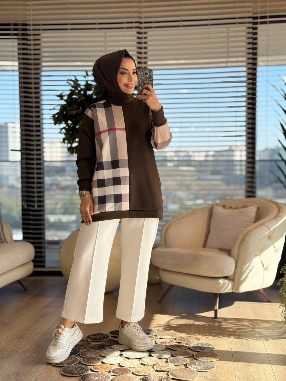 24061 Sol Taraf Kare Desenli Tunik Kahve