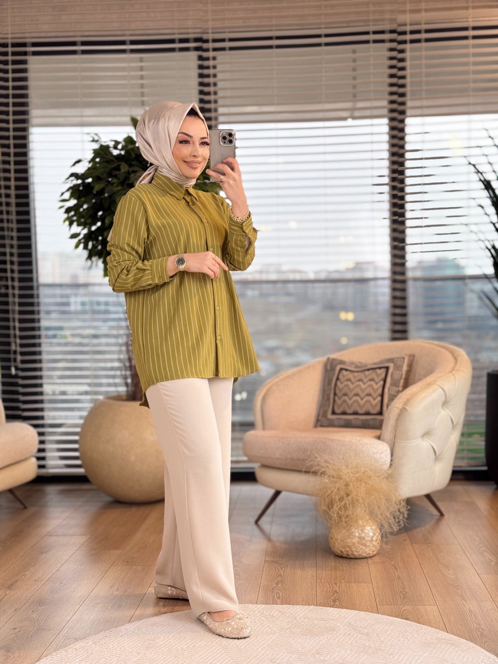 24097 Boyuna Çizgili Gömlek Yağ Yeşili