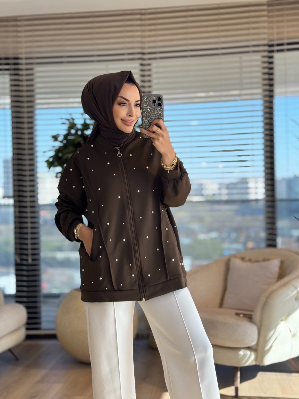 24335 Scuba Ön İnci İşli Fermuarlı Hırka Kahve