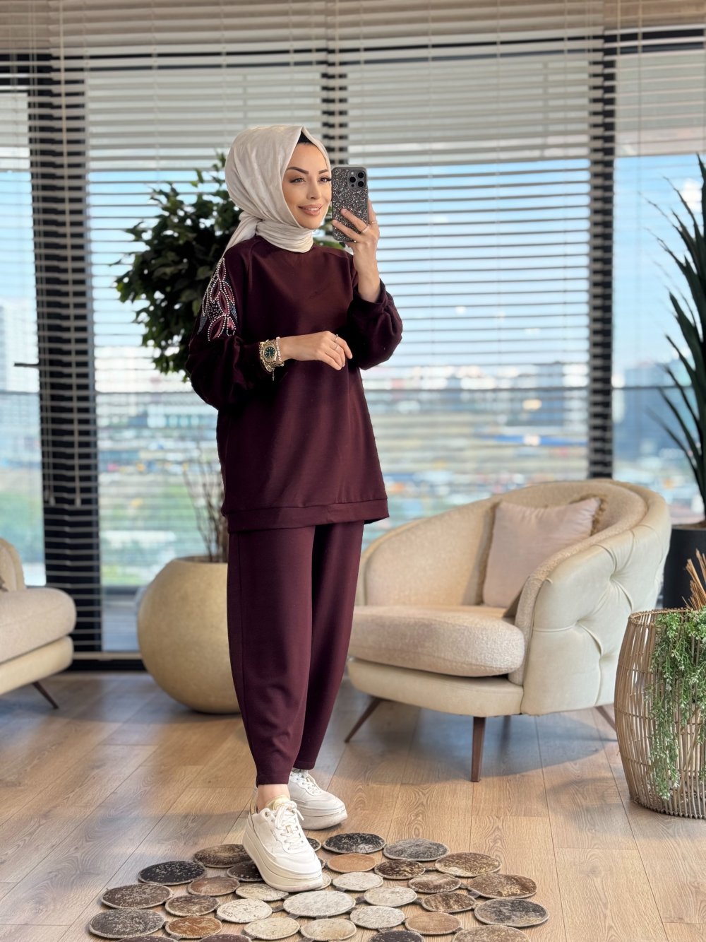 24361 Sol Omzu Boncuk İşli Tunik Bordo