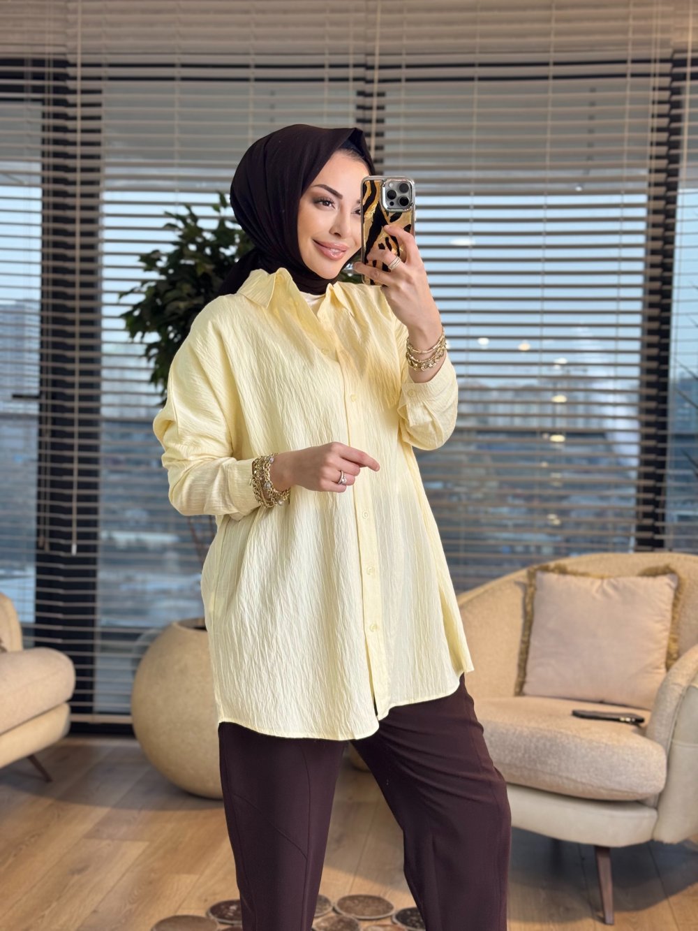 2490 Kendinden Desenli Gömlek Sarı