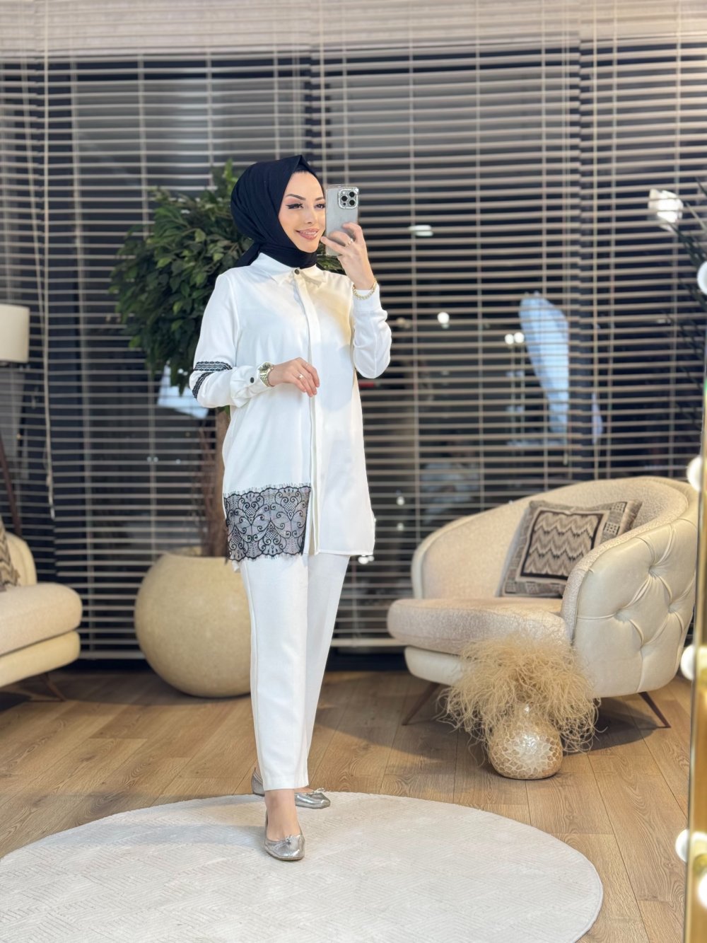 2508 Kol Ve Etek Ucu Dantelli Gömlek Ekru