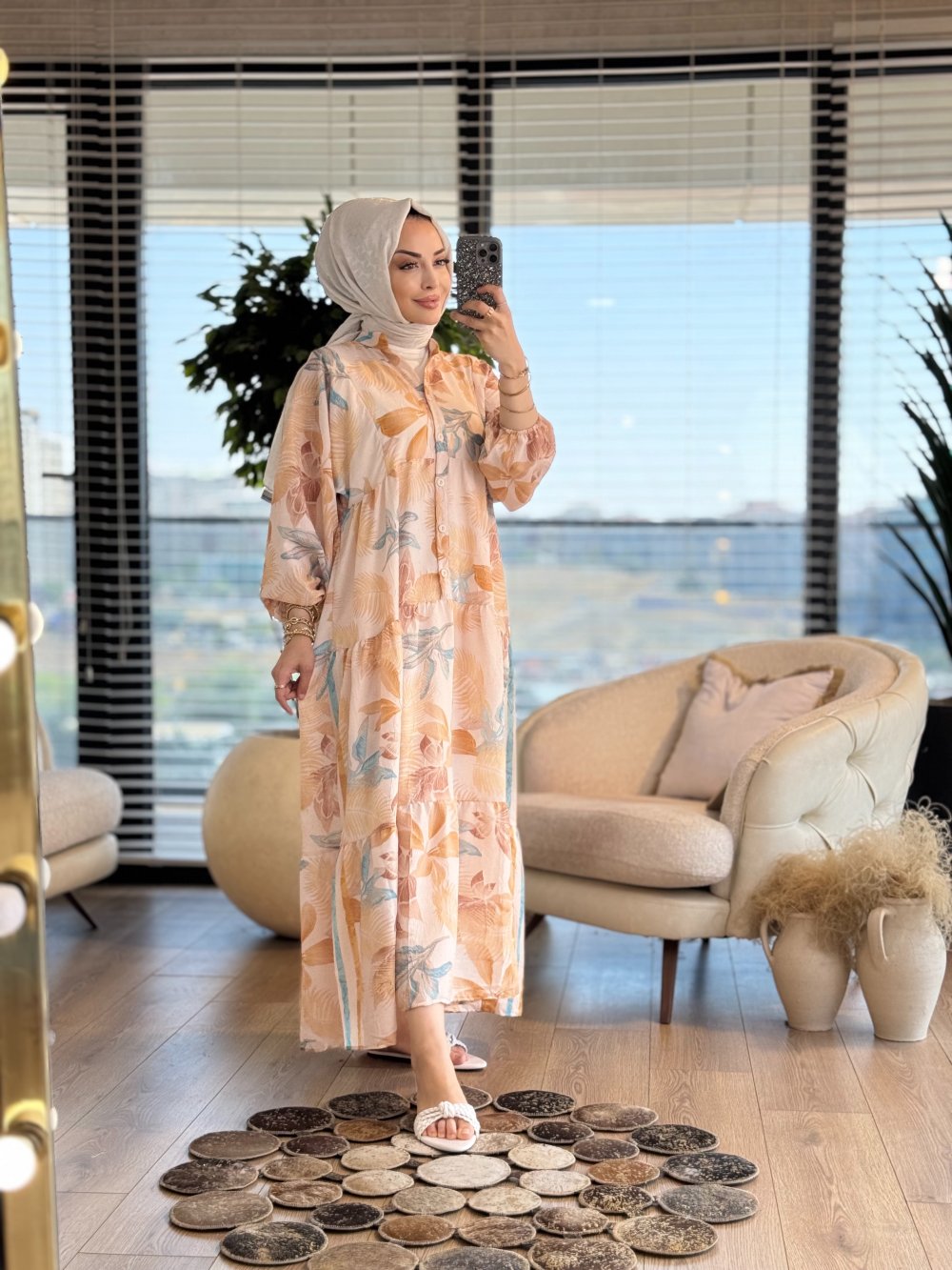 2512-1 Desenli V Yaka Patı Dügmeli Elbise Hardal