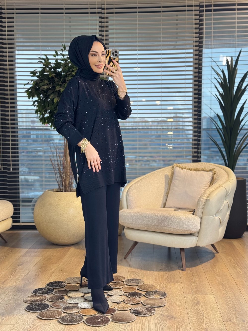 25193 Ön Taş Baskı Yandan Fermuarlı Takım Siyah