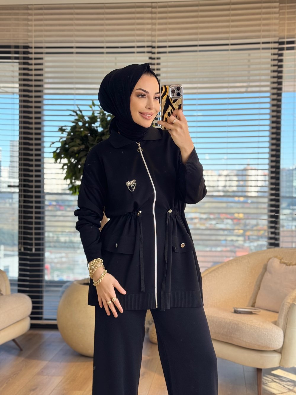 25200 Spor Fermuarlı Broşlu Triko Takım Siyah