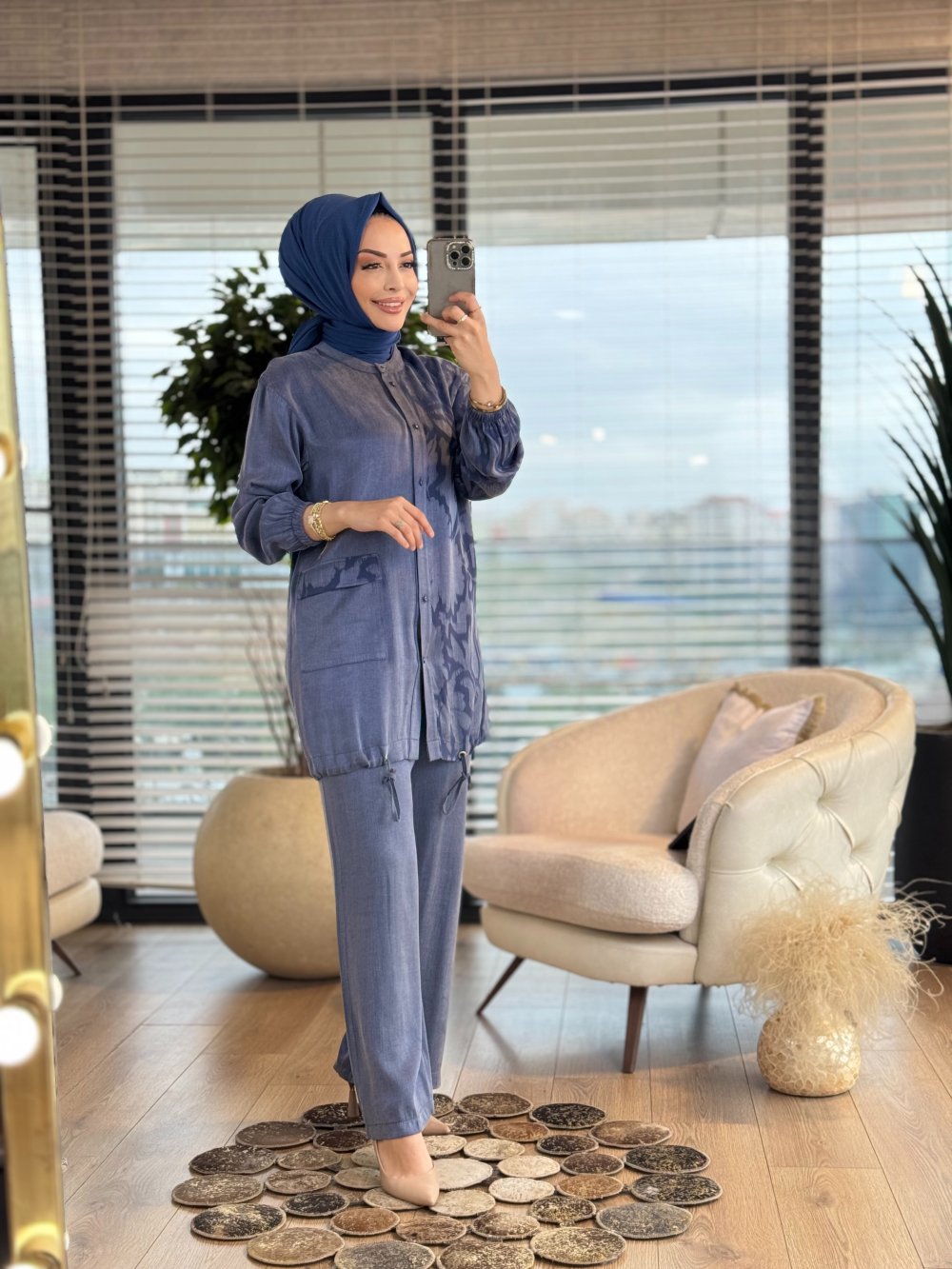 2543 Sağ Taraf Kendinden Desenli Düğmeli Takım İndigo