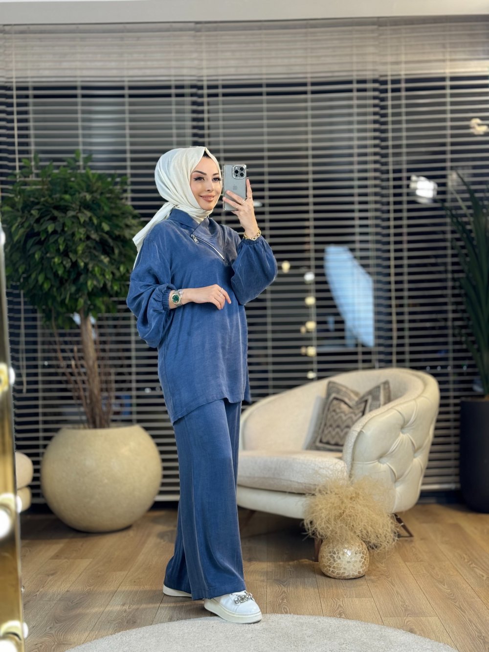 25K1010 Yaka Kenarı Fermuarlı Takım İndigo