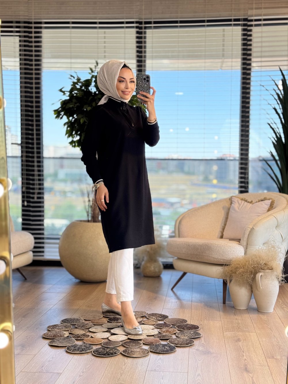 25YT433 Patı Fermuarlı Yaka Kol Ribanalı Tunik Siyah