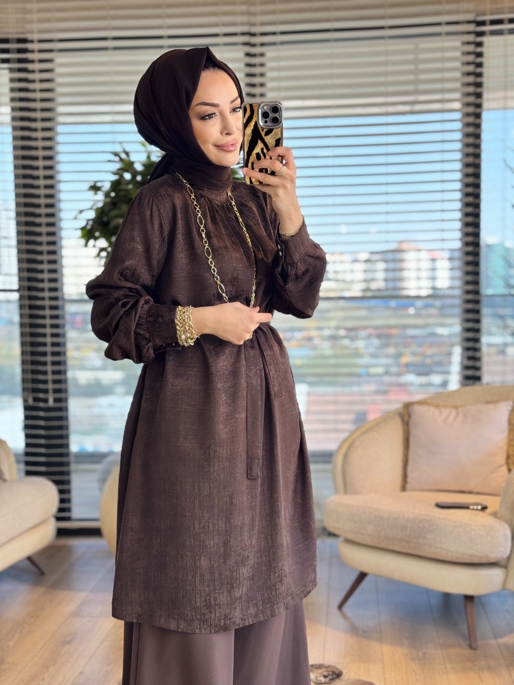 26010 Leylak Jakarlı Tunik Kahve