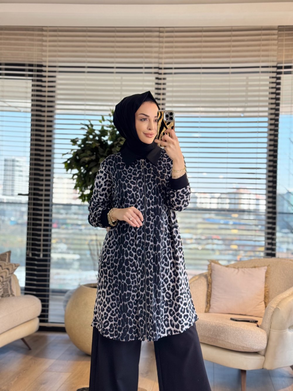 26611 Leopar Desenli Fermuarlı Kap Siyah Gri