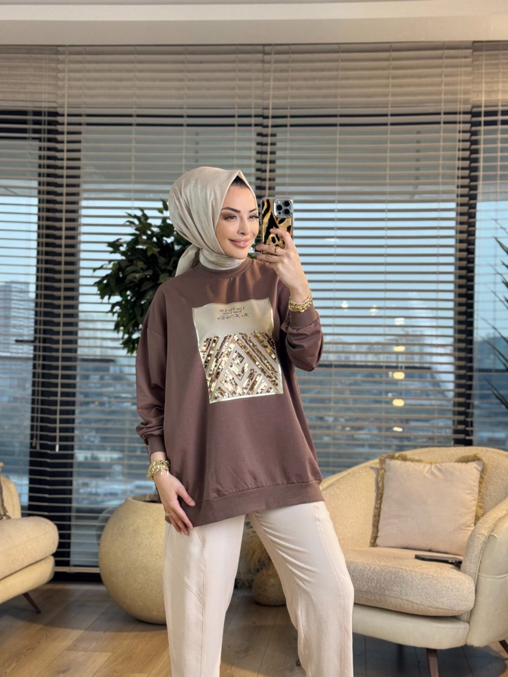 2695 Baskısı Pul Detaylı Sweatshırt Toprak