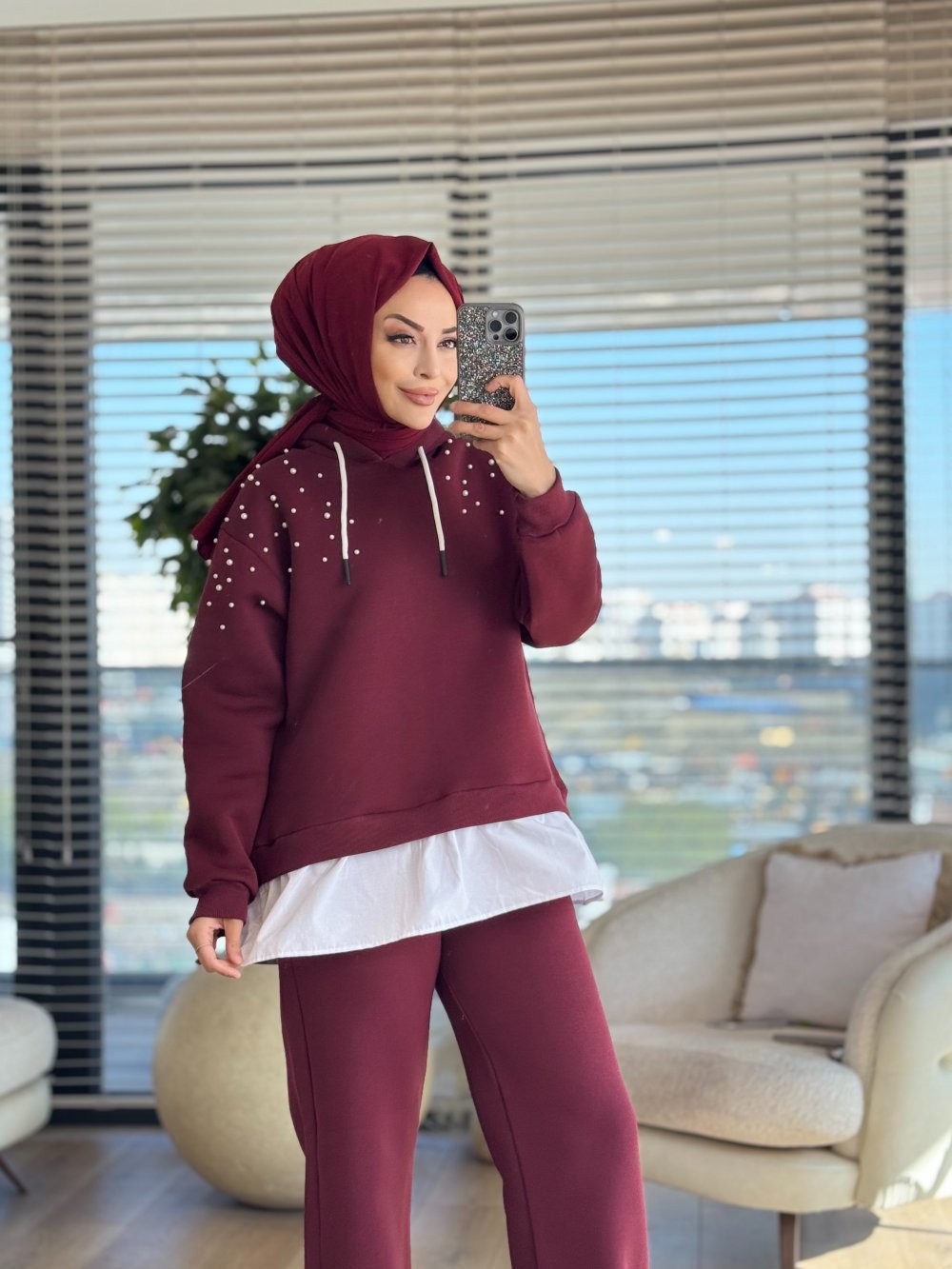 3039 Omuzları İnci İşli İki İplik Takım Bordo