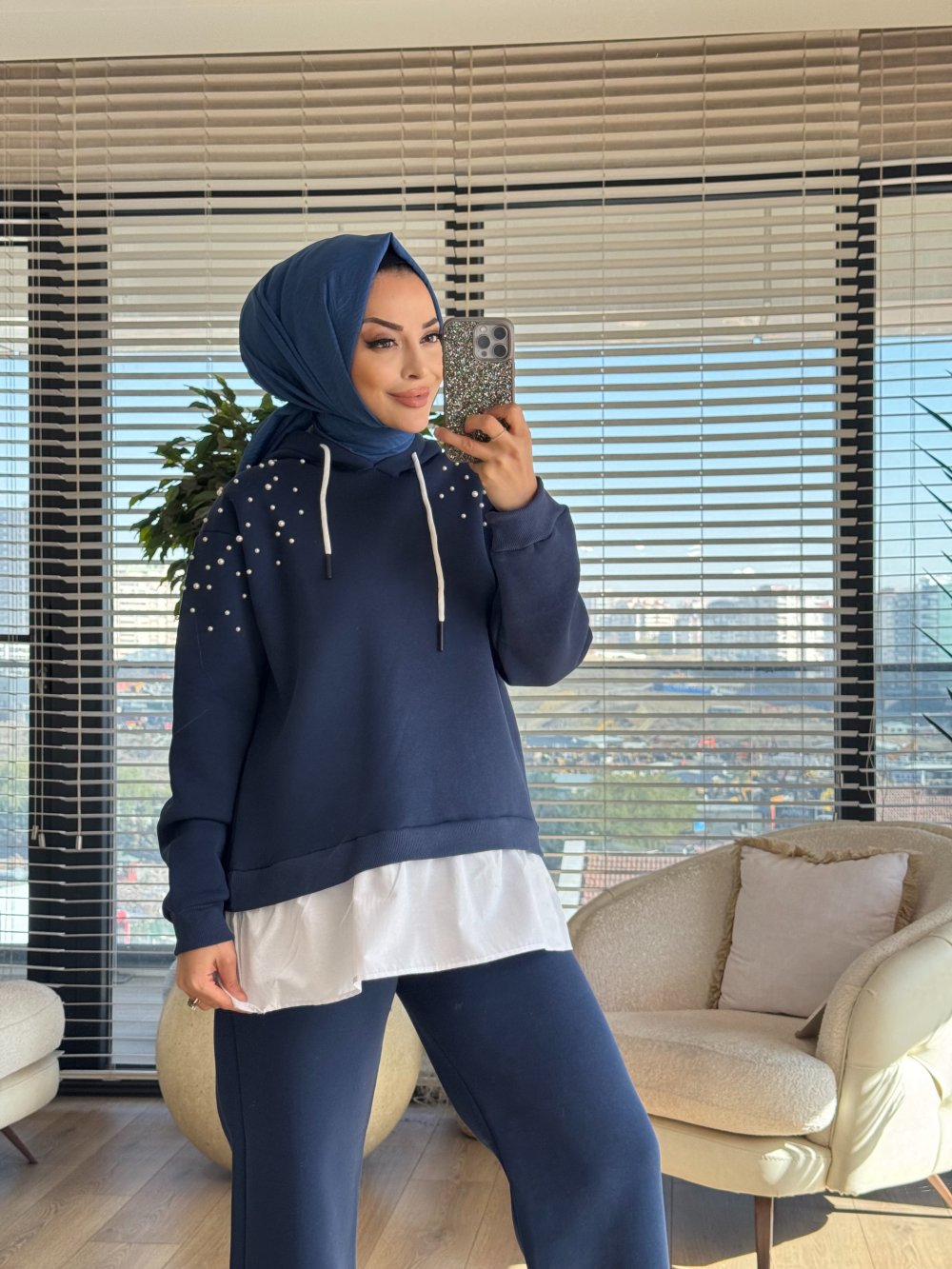3039 Omuzları İnci İşli İki İplik Takım Lacivert