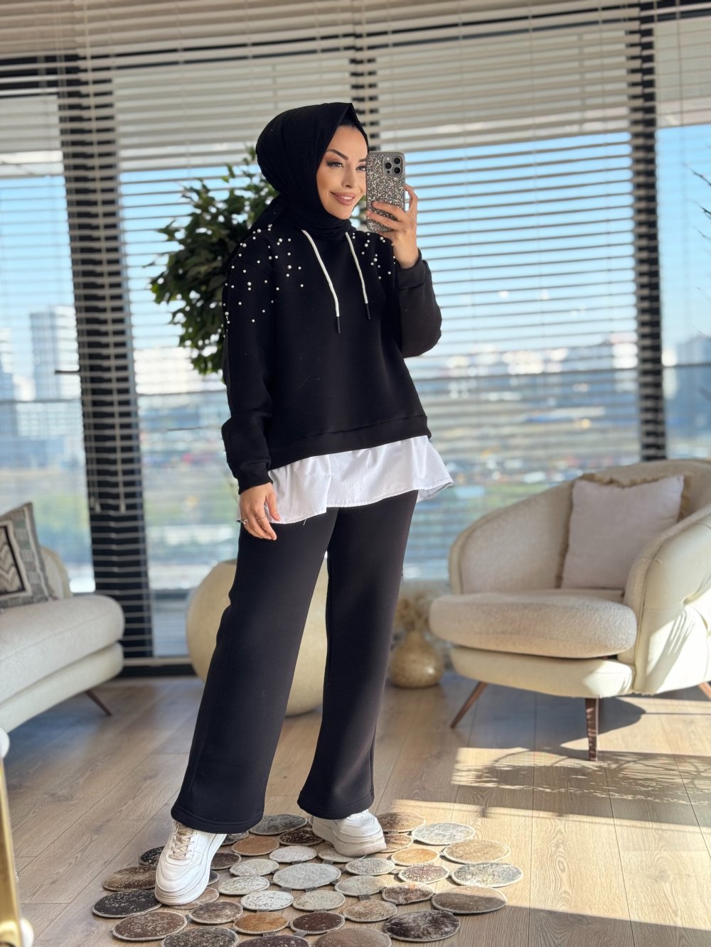 3039 Omuzları İnci İşli İki İplik Takım Siyah