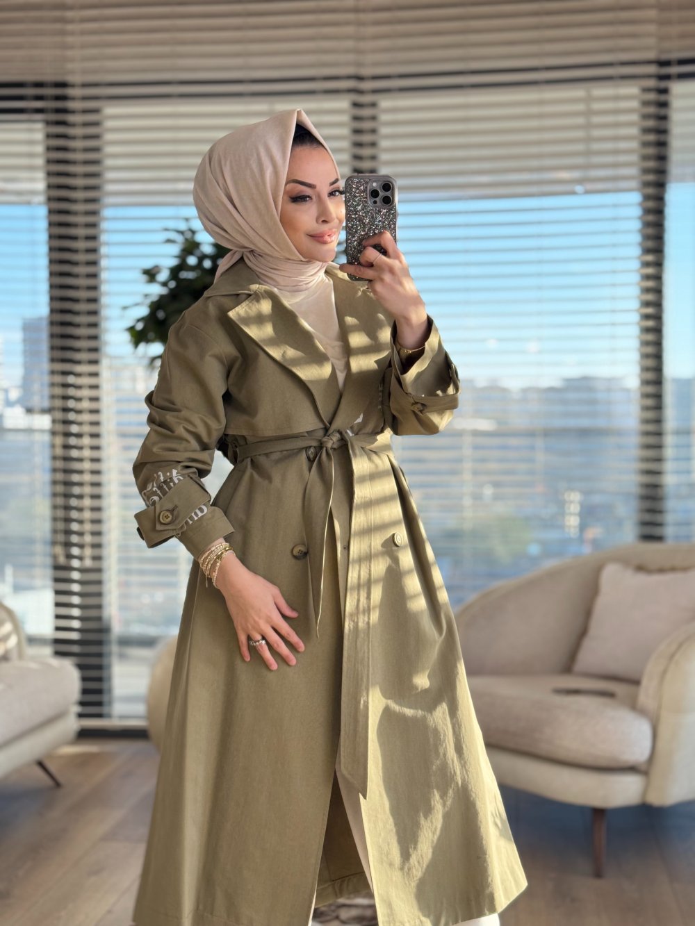 32139 Ön Arka Kol Yazı Baskılı Trenç Haki