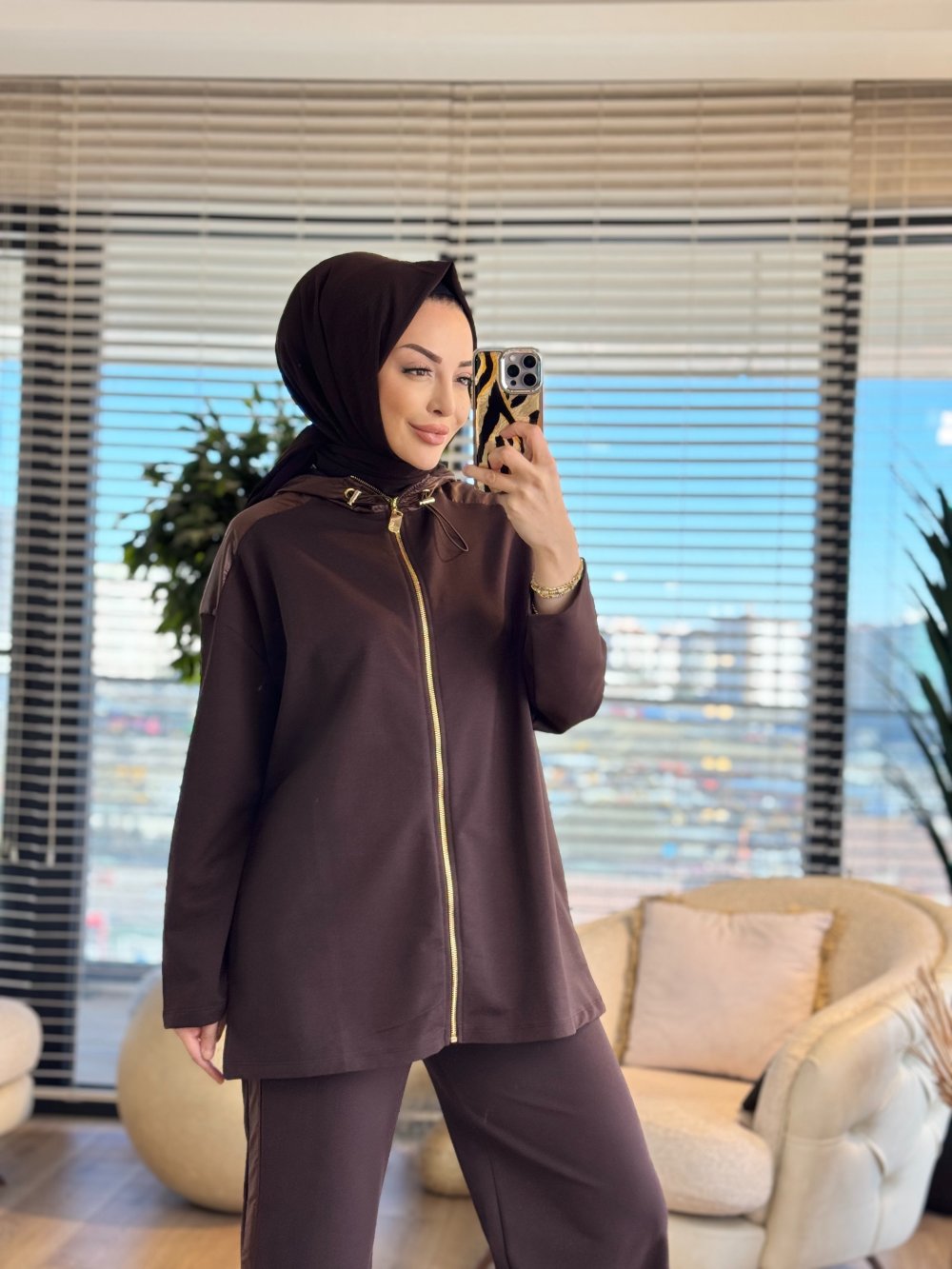 3215 Kontrast Garni Detaylı Takım Kahve
