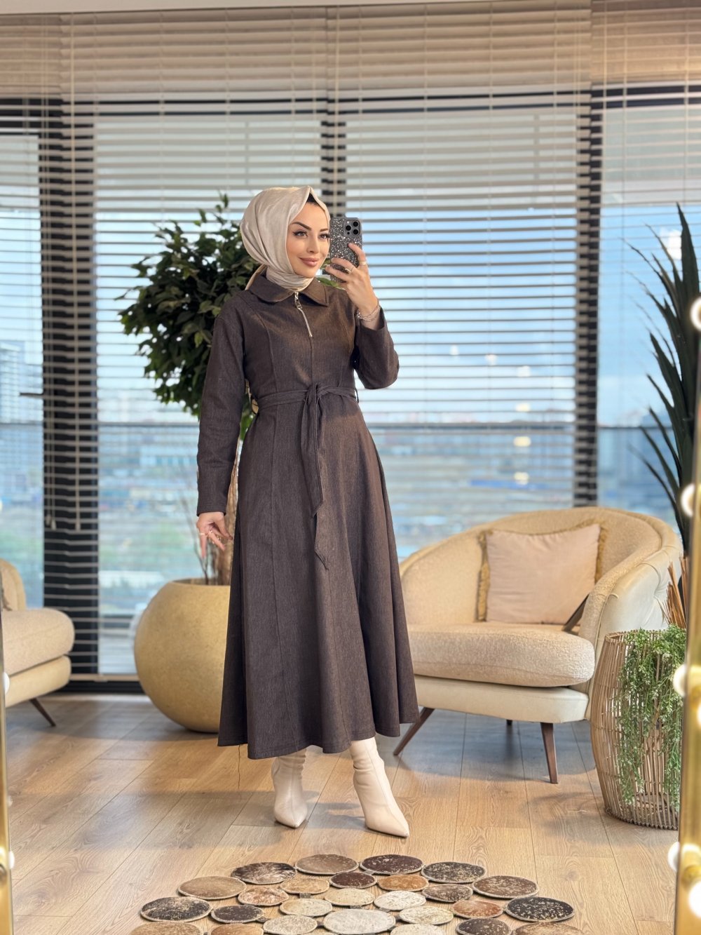 32396 Kot Patı Fermuarlı Dikişli Elbise Kahve